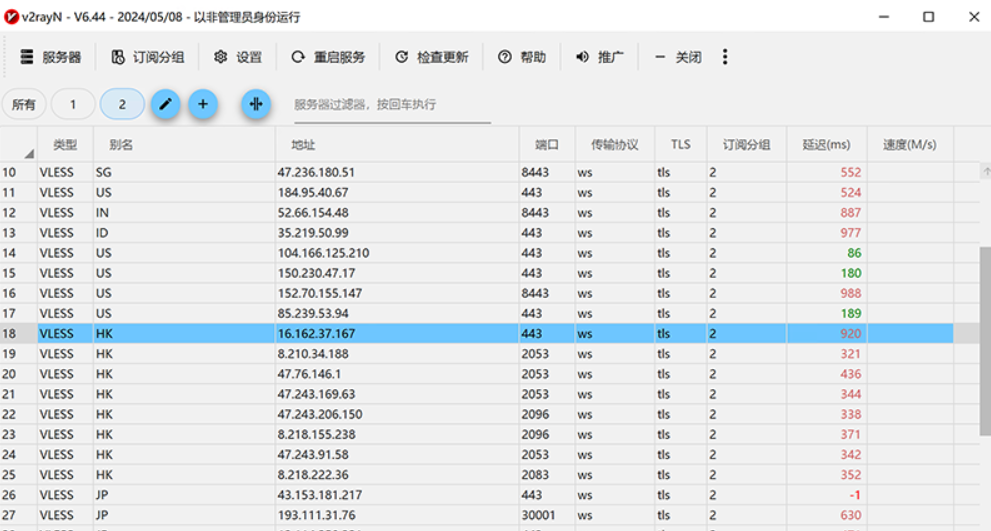订阅完成,会多了很多节点,其实都是一个节点,只是用了不同的优选IP。