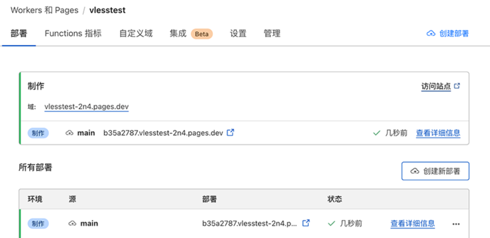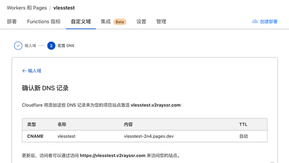 若你的域名不在 CF,或是有其他免费的域名,请会域名解析平台解析如上的 CNAME 记录,若是域名已经托管到了 CF,那么请直接点击 激活域!一般情况下,几十秒就激活完成了!(后续或是需要删掉该项目,请先删除这个 自定义域)