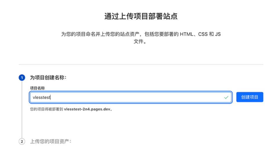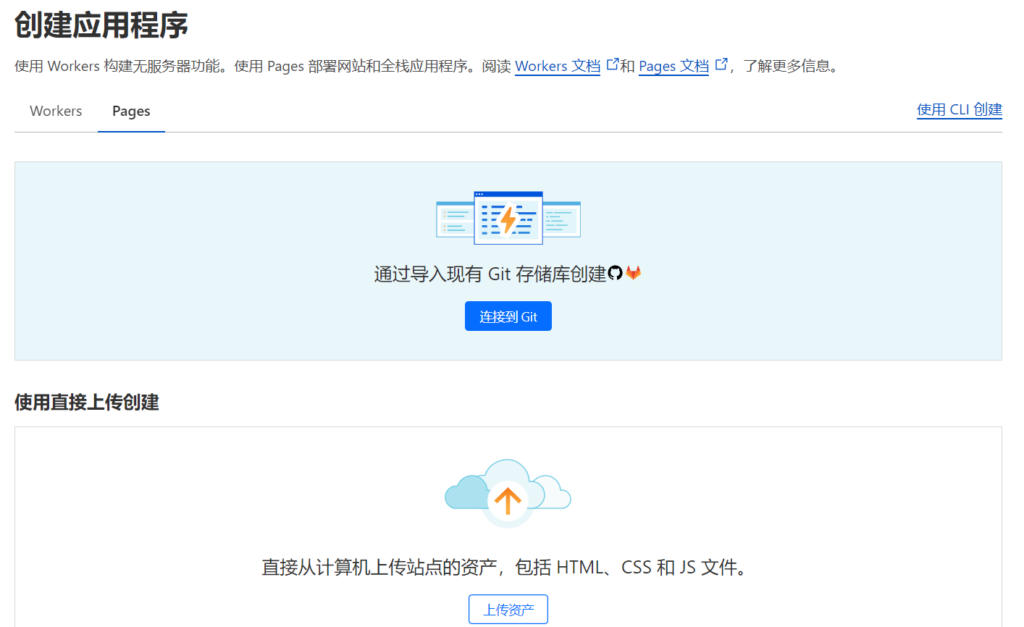首先登录 CloudFlare ,来到 Workers 和 Pages ,然后点击 Pages ,点击 使用直接上传创建 – 上传资产。