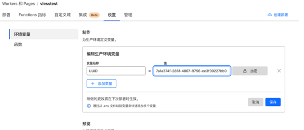 回到刚才的项目,找到设置 – 环境变量 – 添加变量,变量名称:UUID ,变量值为刚才生成的 UUID ,点击保存!